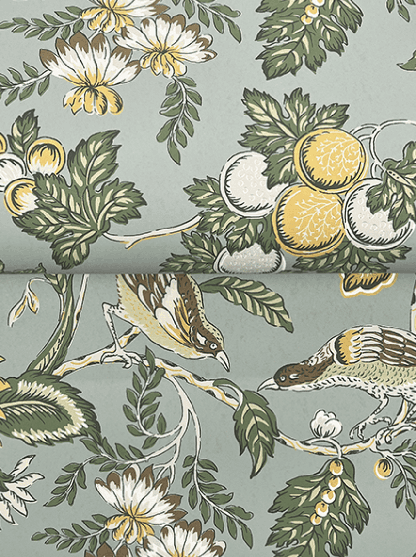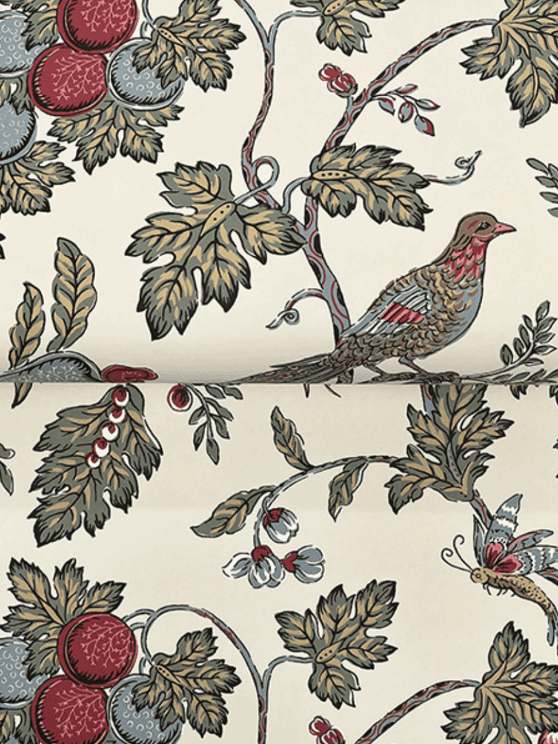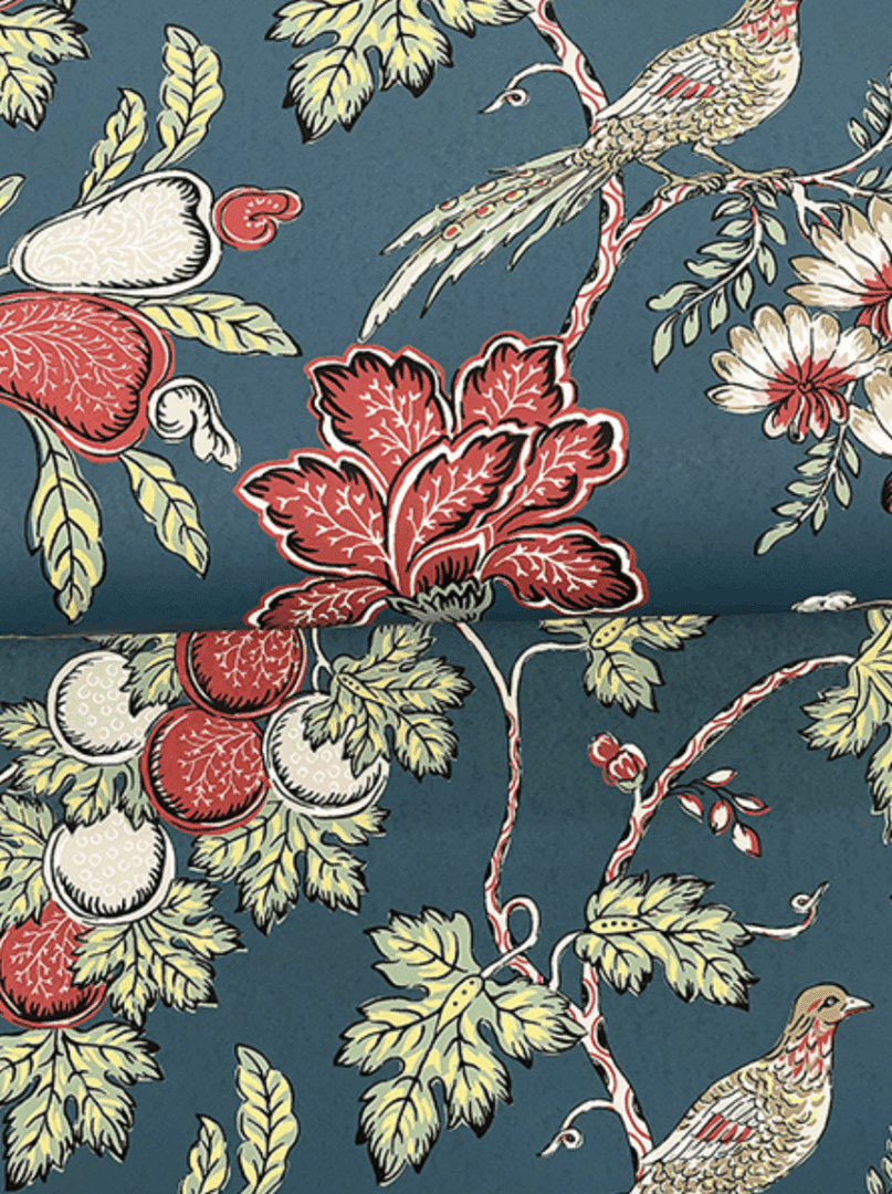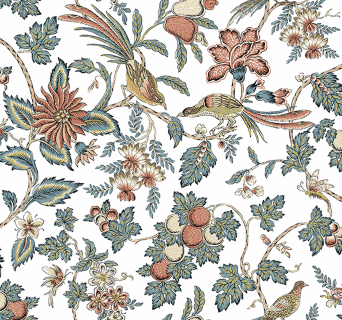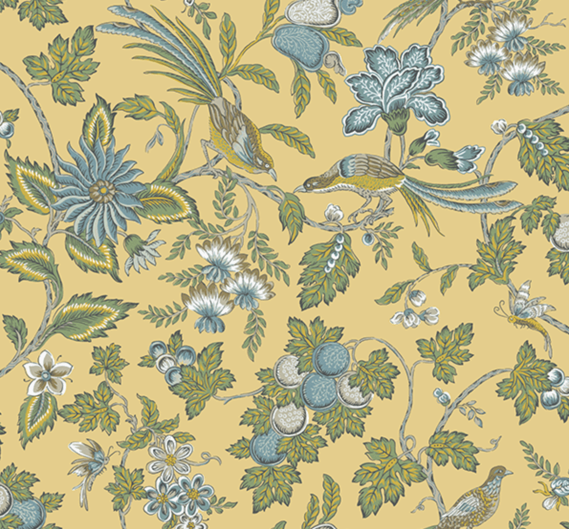 Intricate Jacobean trails of lush blooms and ripened fruit are beautifully interwoven with exotic birds and delicate butterflies in the Parterre pattern.