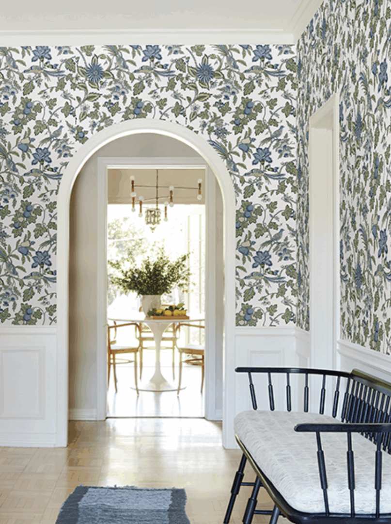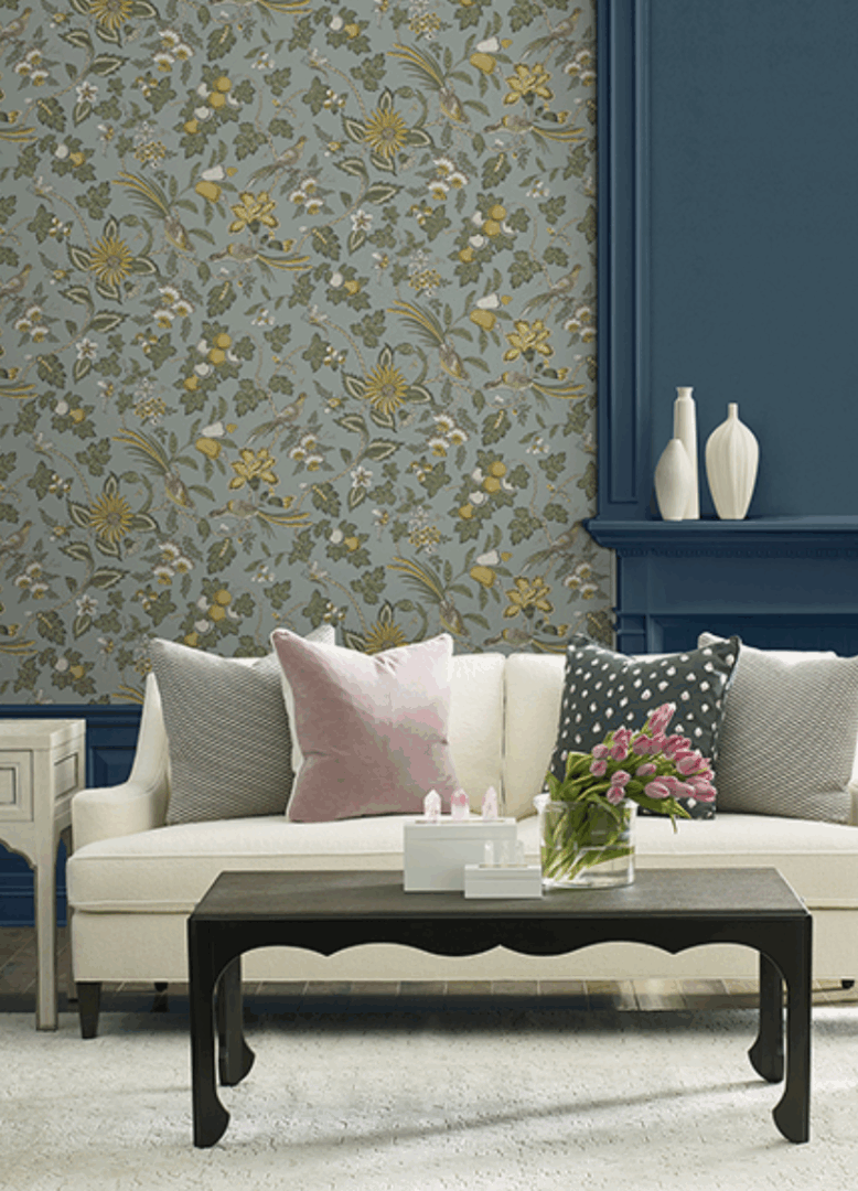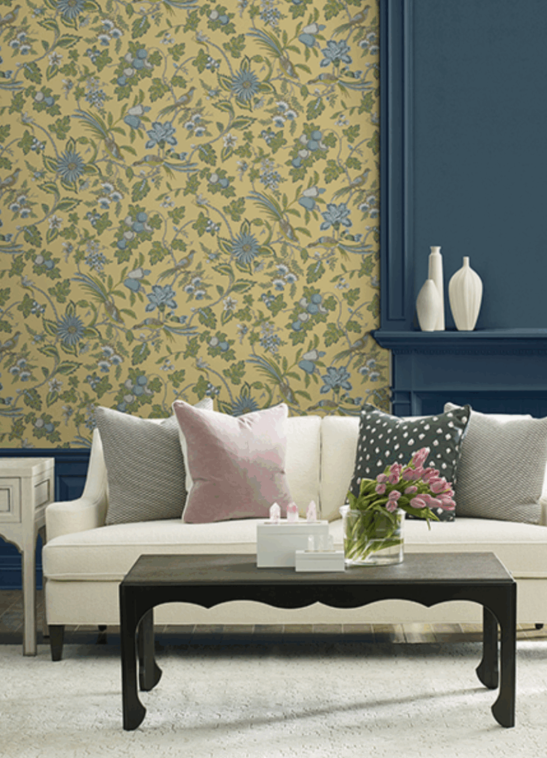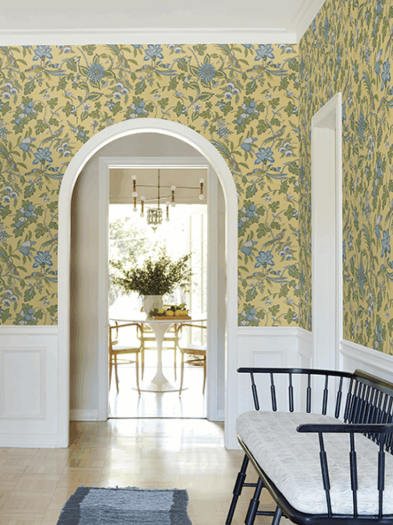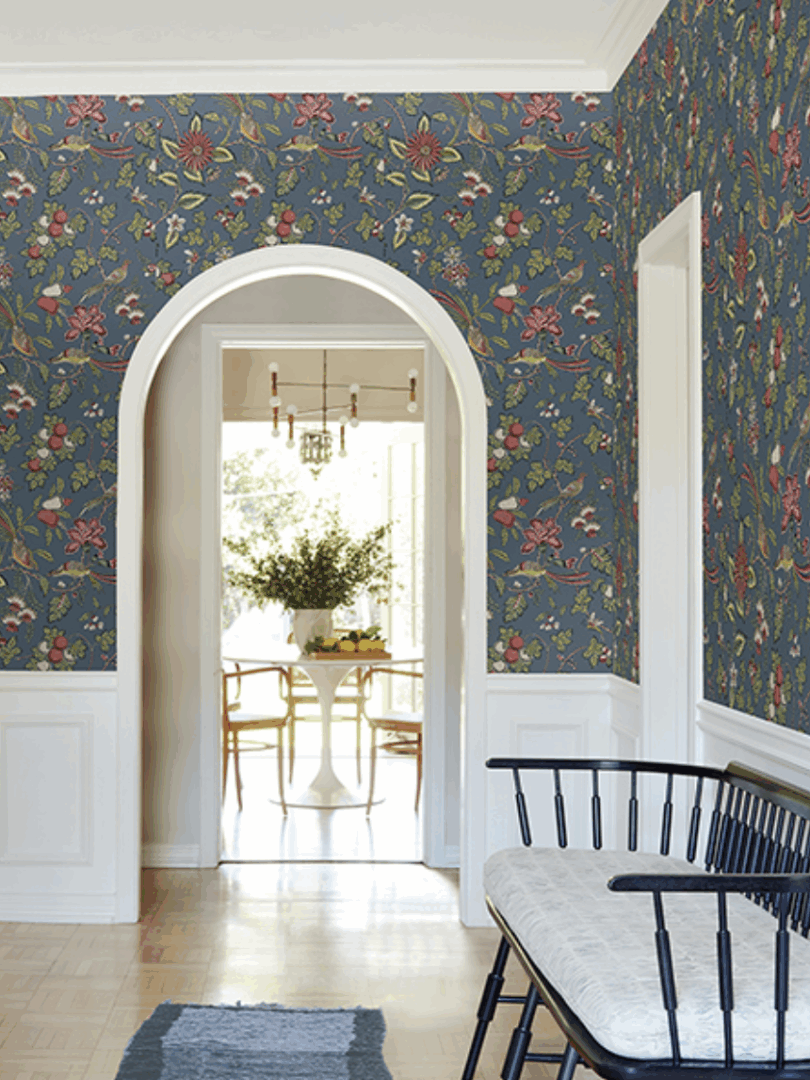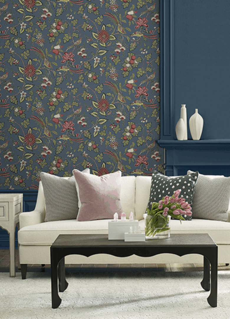 Intricate Jacobean trails of lush blooms and ripened fruit are beautifully interwoven with exotic birds and delicate butterflies in the Parterre pattern.