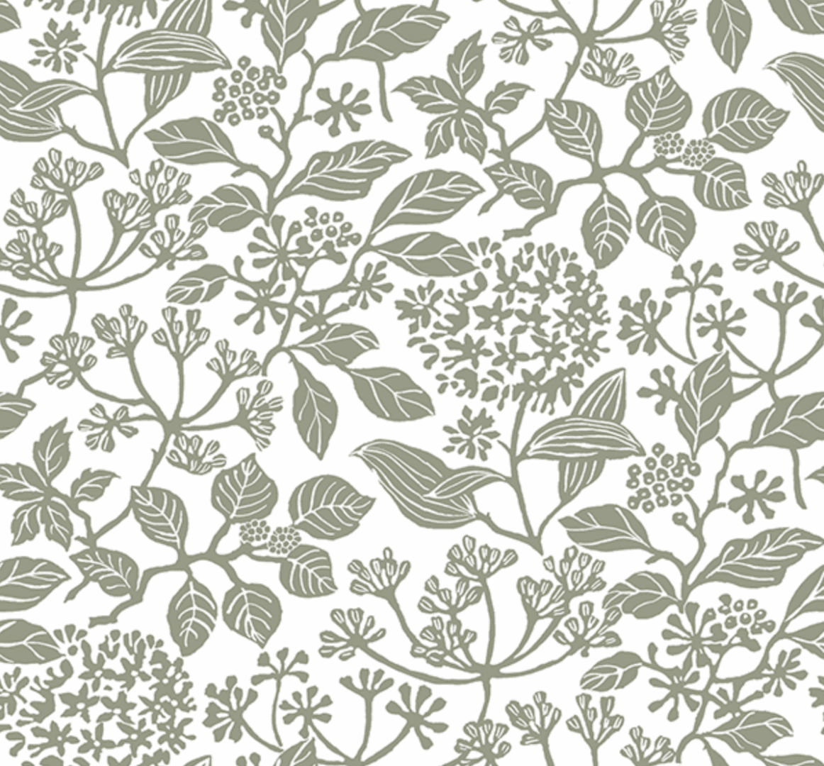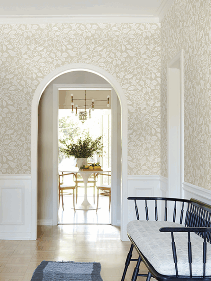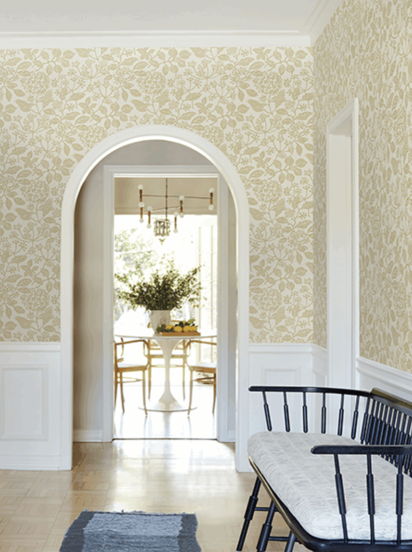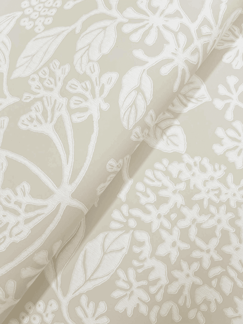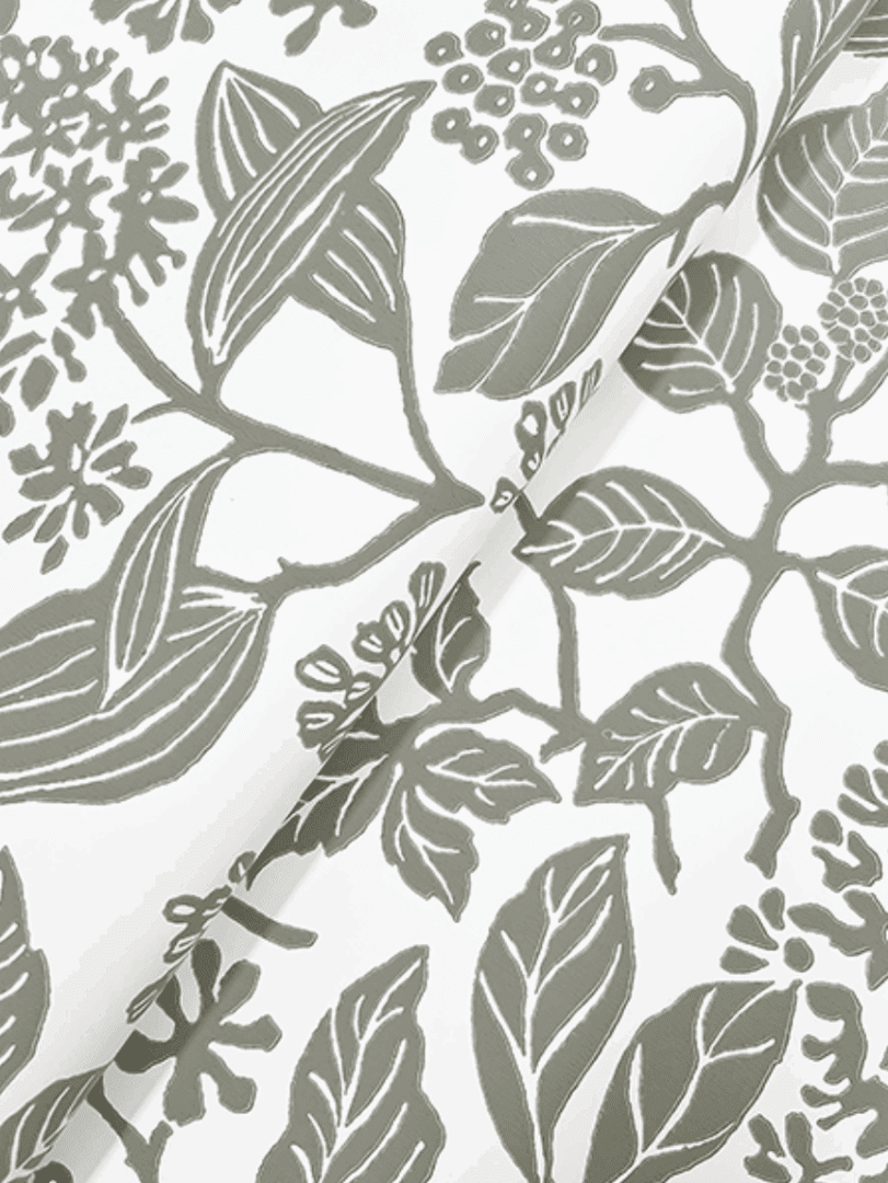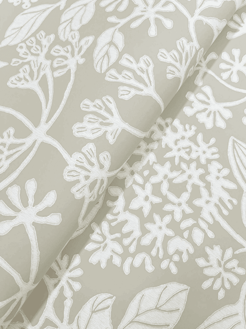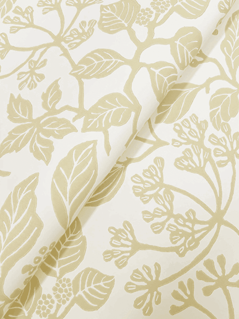 The design celebrates the tree’s cycles of greenery, bloom, and fruit through delicate artistic silhouettes in an inked botanical wallpaper.