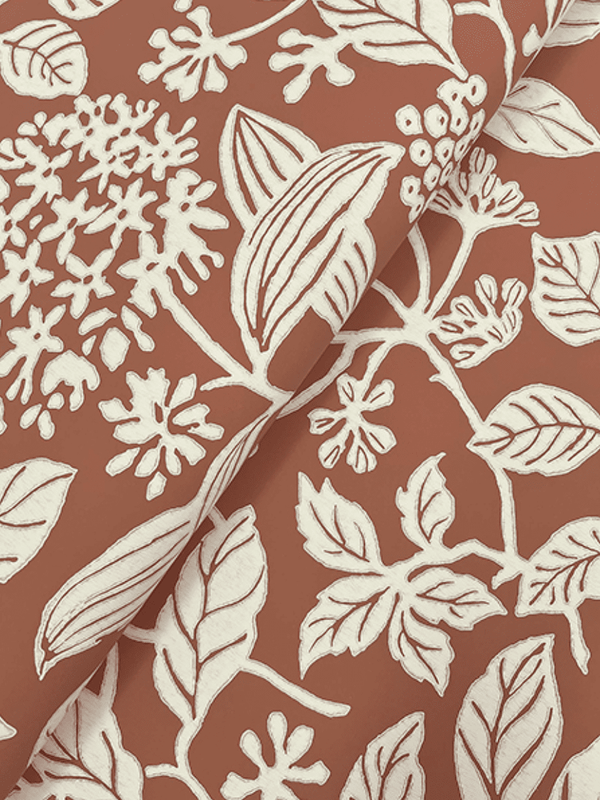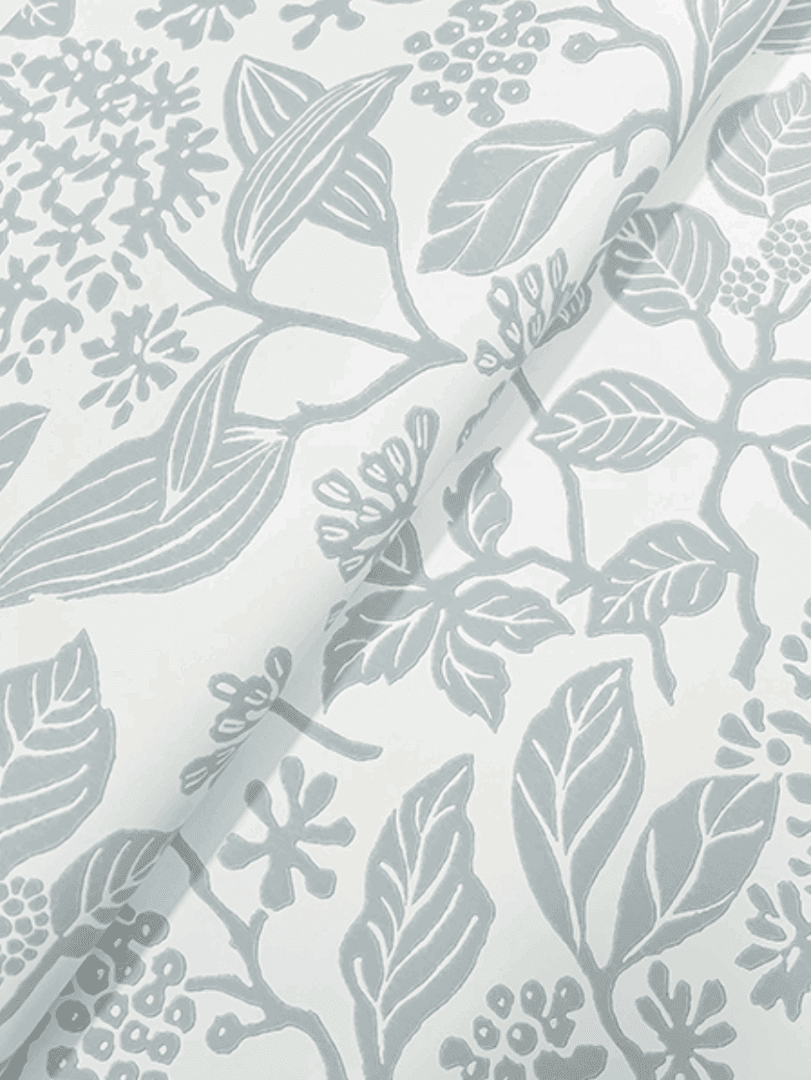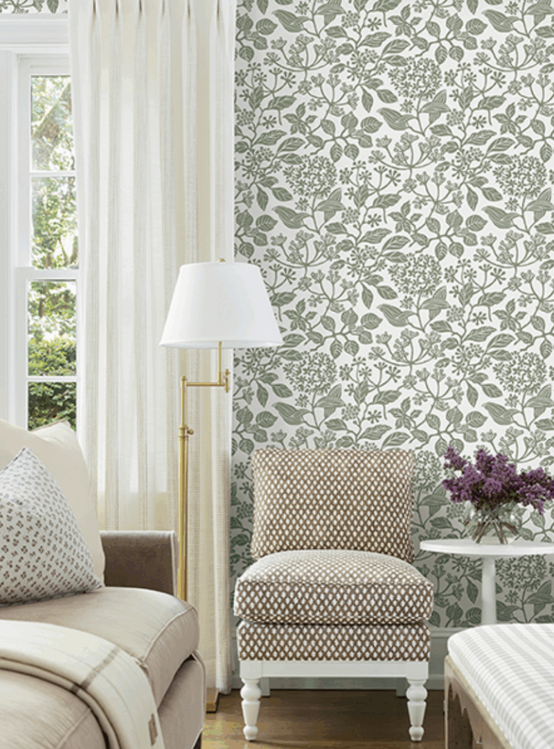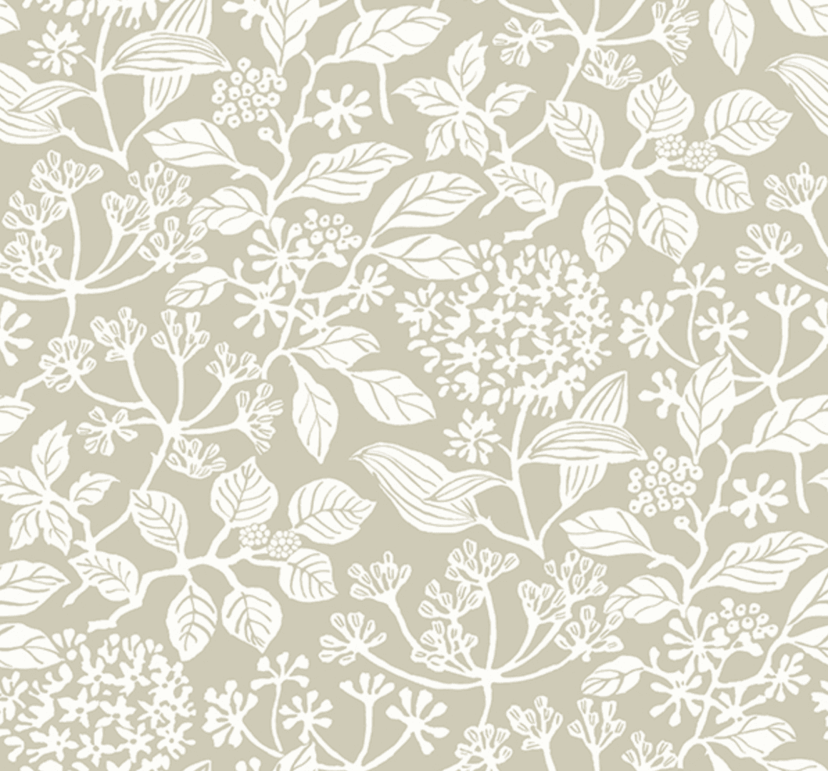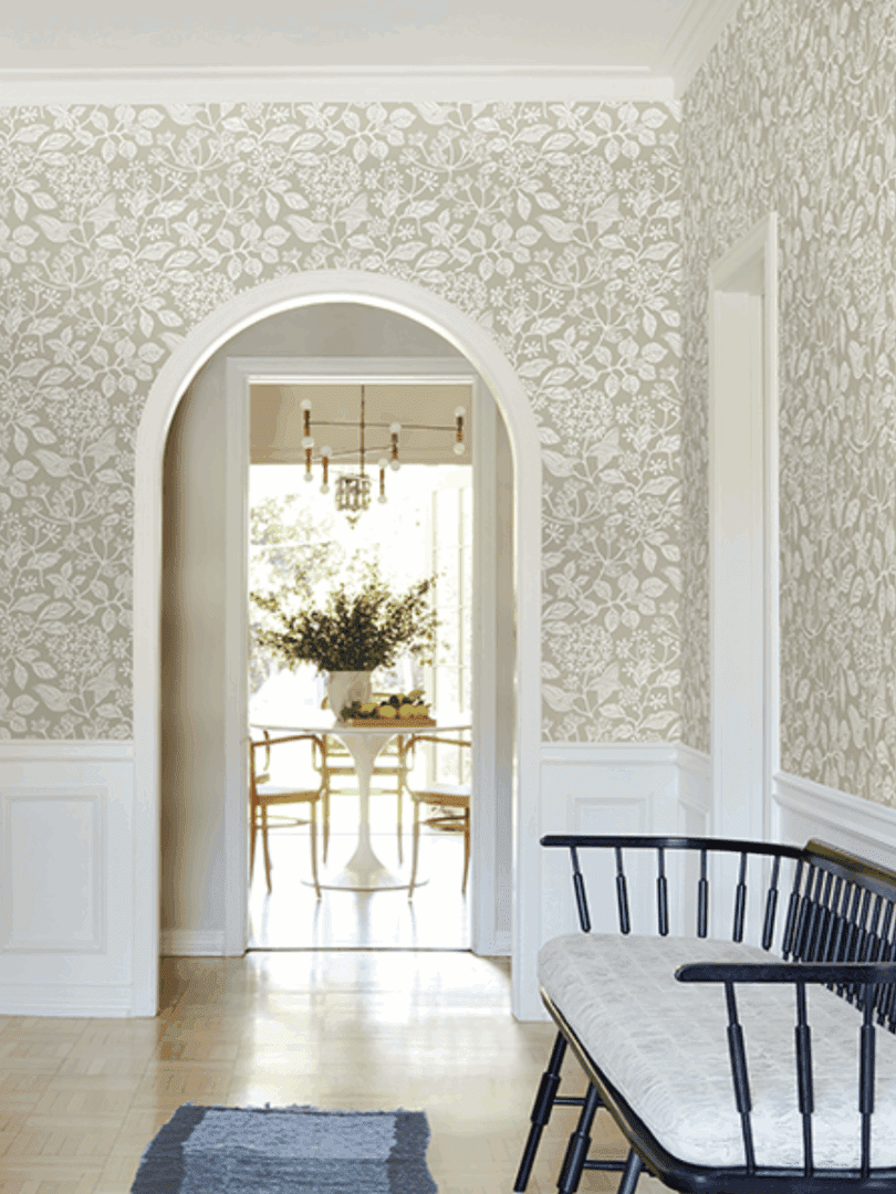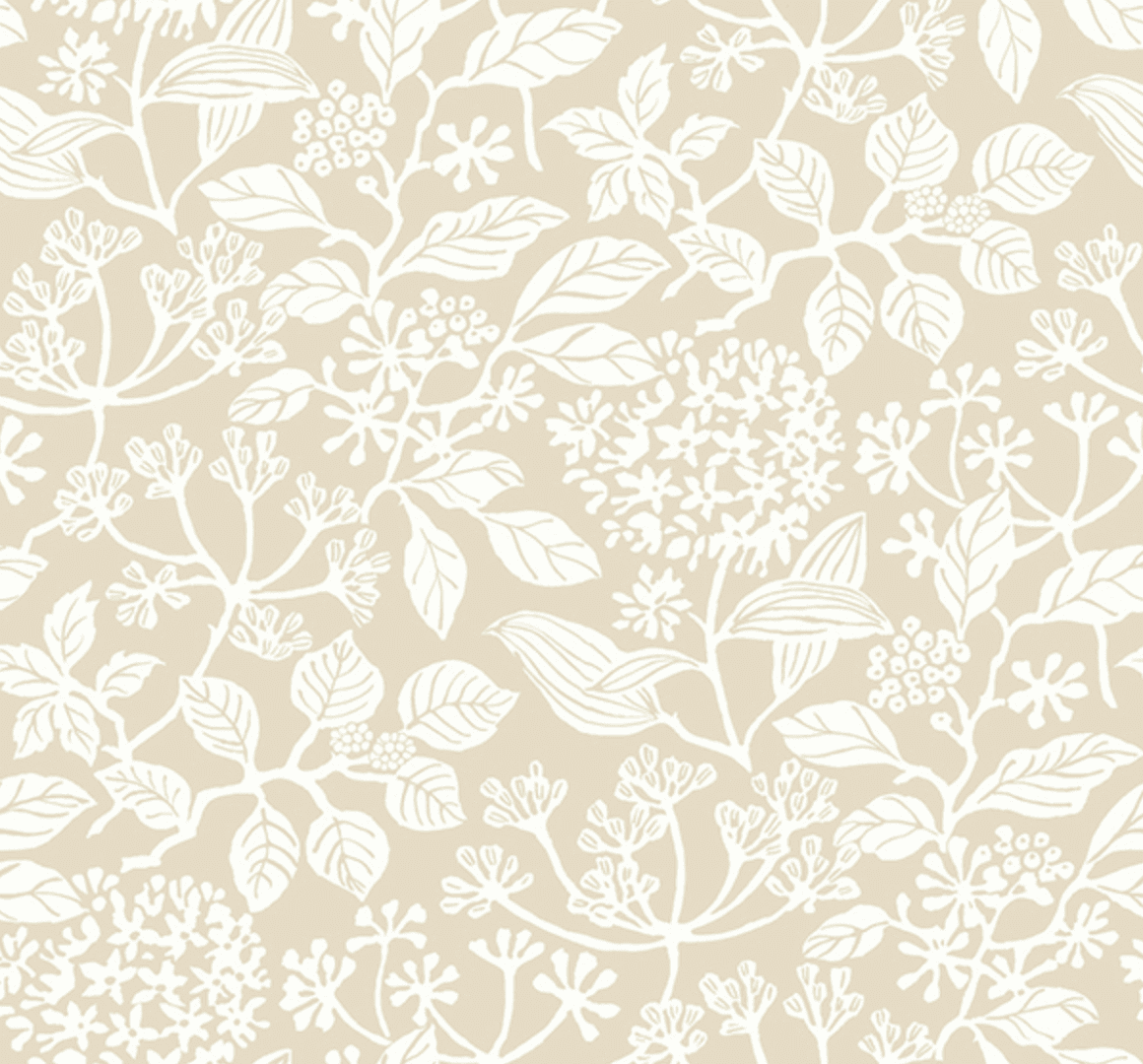 The design celebrates the tree’s cycles of greenery, bloom, and fruit through delicate artistic silhouettes in an inked botanical wallpaper.