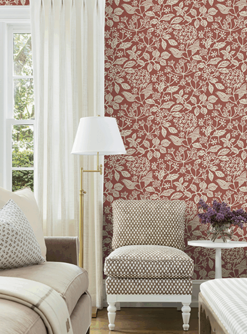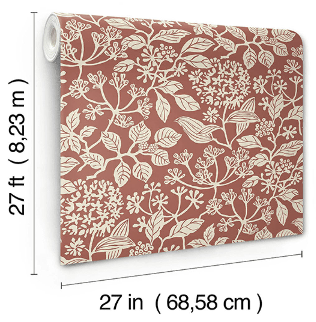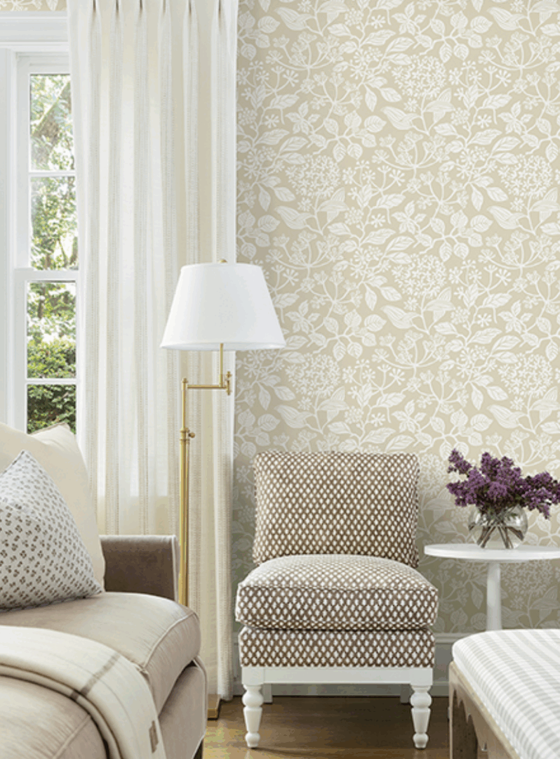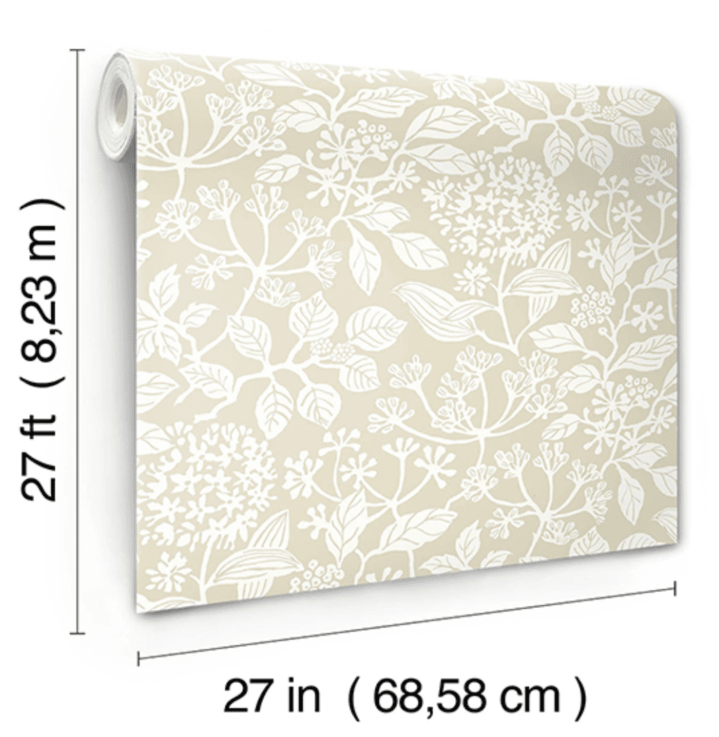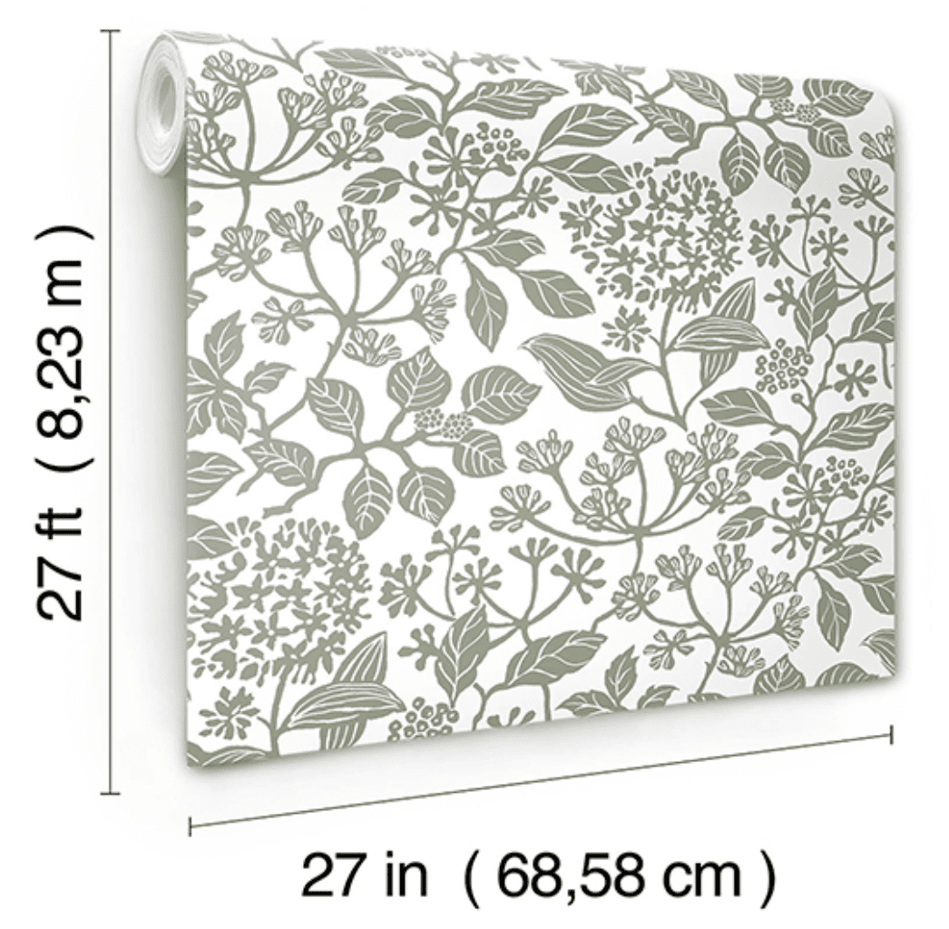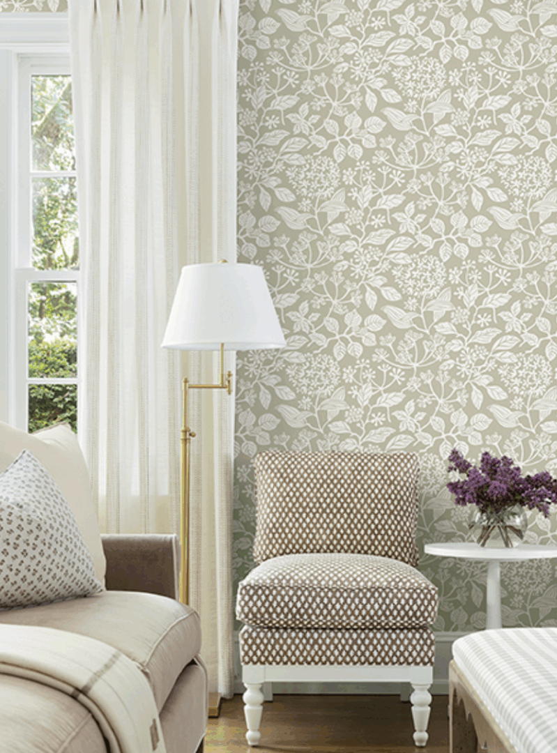The design celebrates the tree’s cycles of greenery, bloom, and fruit through delicate artistic silhouettes in an inked botanical wallpaper.